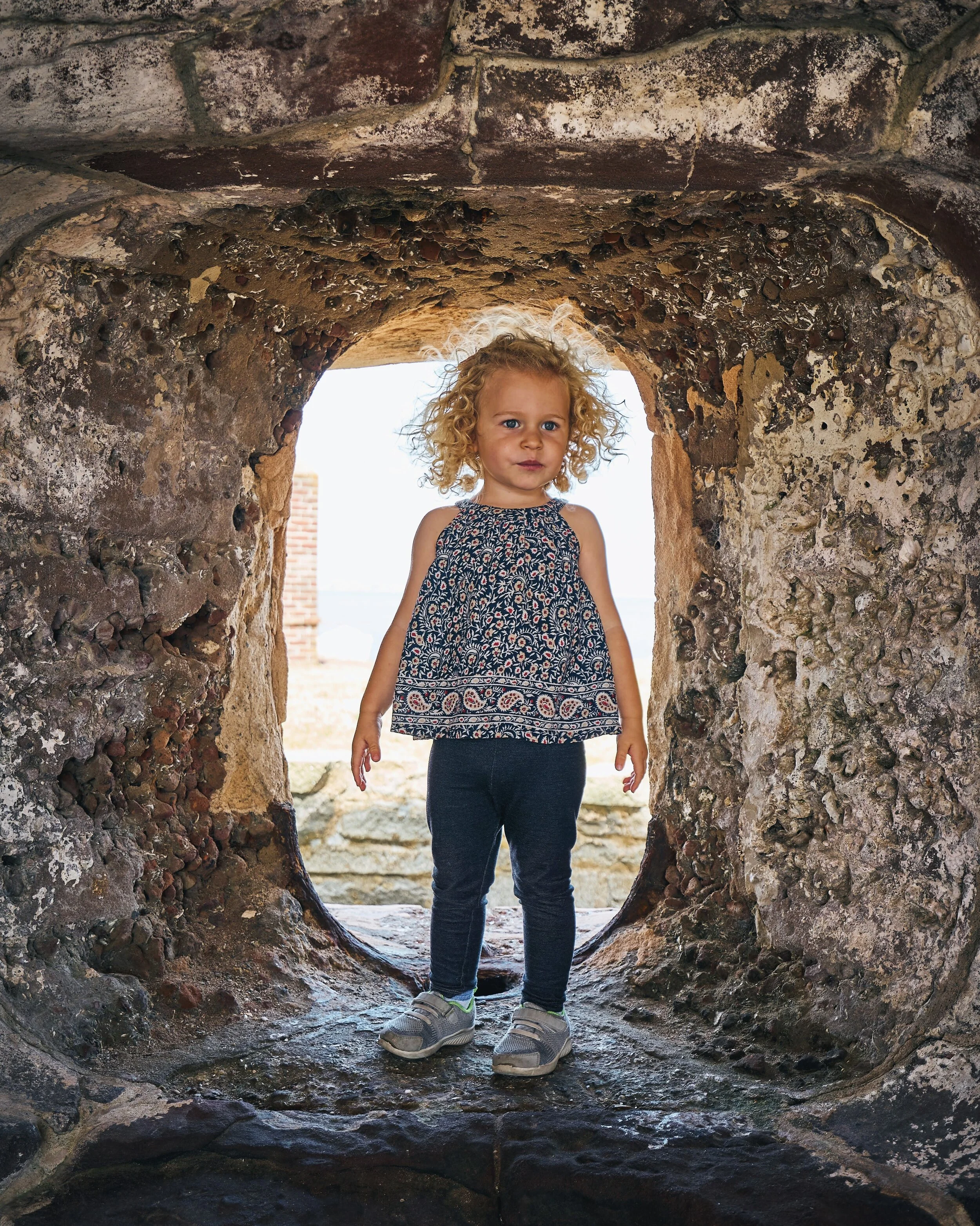 Apres avoir erré à travers les ruines en briques rouges, les meurtrières et d’anciens canons, nous montons un ensemble d'escaliers pour rejoindre un bunker noir, ajouté lors de la Seconde Guerre mondiale.